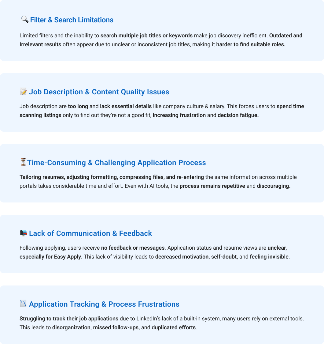 LinkedIn users face long application flows, lack of tracking after applying, scam job posts, and irrelevant search results; turning the job hunt into a confusing and discouraging experience.
